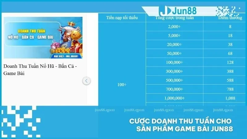 Chương trình này mang đến cơ hội tích lũy thưởng hấp dẫn cho các thành viên tham gia sảnh Game Bài, Nổ Hũ và Bắn Cá. Chỉ cần có tổng cược hợp lệ từ 2.000 điểm trở lên mỗi tuần, người chơi sẽ nhận được các phần thưởng giá trị tương ứng, từ 8 điểm (doanh thu 2.000+) đến 38.888 điểm (doanh thu 35.000.000+). Phần thưởng được hệ thống tự động phát vào 12h00 thứ 2 hàng tuần và chỉ yêu cầu một vòng cược để rút.